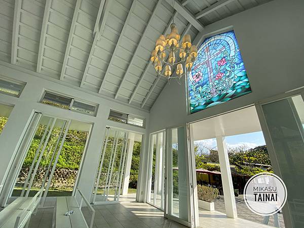 教堂裡面有很多白色椅子,採光很好非常好拍,這是廣角所以看起來有點變形,不過裡面的光線拍起來照片很美。